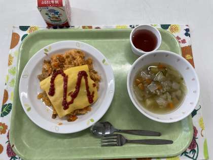 献立 オムライス 角切り野菜のスープ ぶどうゼリー 牛乳
