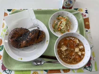 献立 セサミ揚げパン 西湖豆腐のスープ 春雨サラダ 牛乳