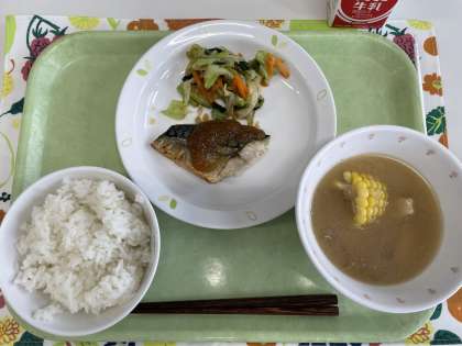 献立 ごはん さばのおろしかけ 野菜のポン酢和え とうもろこしのみそ汁 牛乳