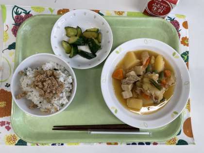 献立 ツナそぼろわかめごはん 肉じゃが きゅうりの南蛮漬け 牛乳
