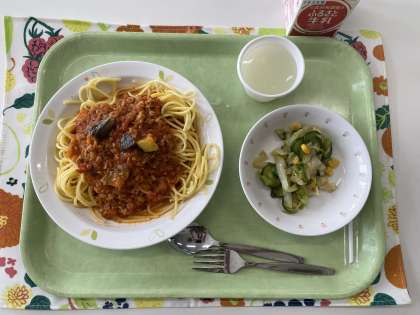 献立 夏野菜のスパゲティ コーンサラダ カルピスゼリー 牛乳