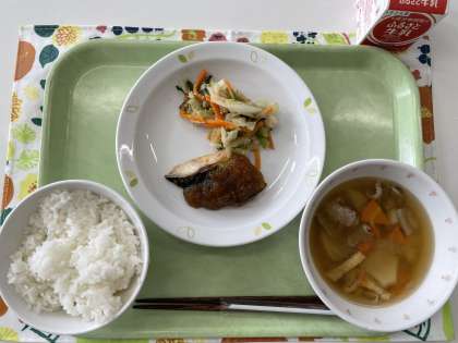 献立 ごはん 鯖のおろしだれ キャベツのごまみそサラダ 豚汁 牛乳