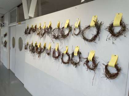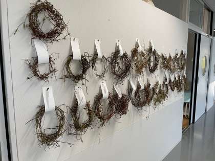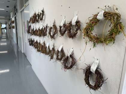 1学期から育てている、アサガオのつるをまとめ、リースの土台を作りました。