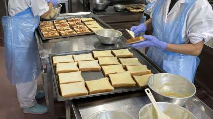 5 オーブン(トースターも可)で焼く。給食では、220度のスチームを入れたオーブンで8分くらい焼きます。