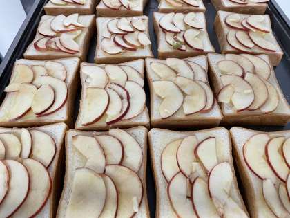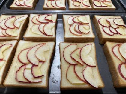 4 食パンに 3のシュガーバターをぬる。りんごスライスを6〜10枚並べる。
