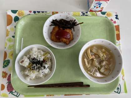 献立 さつま芋ご飯 石狩汁 とうふナゲット 昆布の佃煮 牛乳