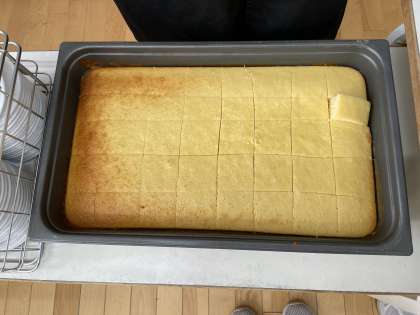 ☆ぐりとぐらのかすてらの絵本をイメージして、クラス毎に大きく焼いて切り分けました。