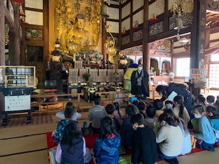 九品仏・浄信寺では、世田谷区で古くから親しまれている「おめんかぶり」の行事などについて、説明をしていただきました。浄信寺オリジナルキャラクターの「きゅっぽん」のかわいさに児童はメロメロになっていました。