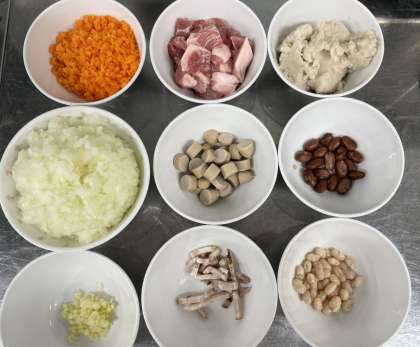 1.にんにく、玉ねぎ、にんじんはみじん切りにする。ベーコンは千切り、ウインナーは1cmの厚みに切っておく。豚肉は、液体塩麹で下味をつけて30分〜1時間おいておく。
