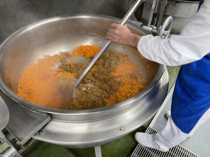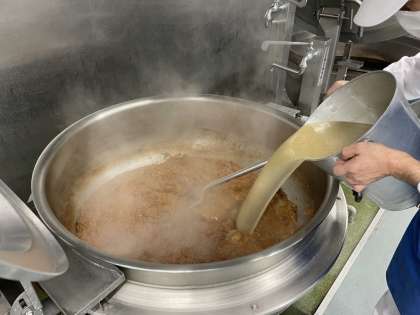 4.ホールトマトとソースを入れて一煮立したらスープを入れて煮込む。