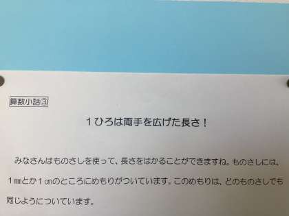 今回の算数小話は「1ひろは両手を広げた長さ!」というタイトルで、単位についてのお話を掲示しています。3年生は重さの学習で、新しい単位「g」「kg」、4年生は面積の学習で「a」「ha」などを知りました。日本には昔、「ひろ」という単位が使われていたそうです。他にも「つか」「あた」と呼ばれる単位もあったそうです。世界でも「インチ」や「ヤード」などの単位がありますね。それぞれ、どのくらいの大きさを表しているのか調べてみるのも面白いですね。