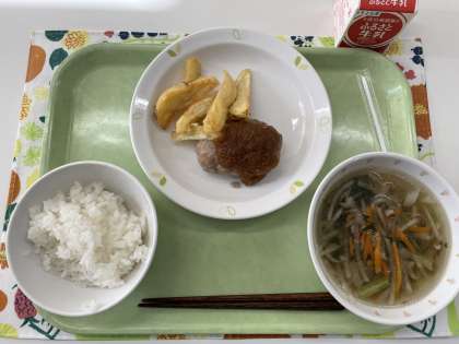 献立 ごはん ハンバーグ フライドポテト 千切り野菜のスープ 牛乳