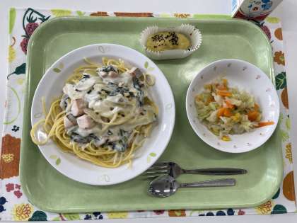 献立 鮭のクリームスパゲティ キャベツとコーンのサラダ スィートポテト 牛乳