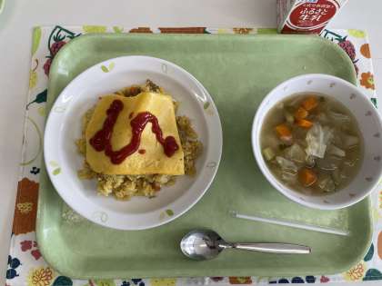 献立 オムライス(カレーピラフ) 角切り野菜のスープ 牛乳