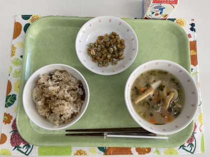 献立 鶏めし だんご汁 ポリポリ大豆 牛乳