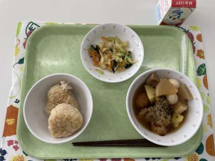 献立 焼きおにぎり おでん(静岡風) 糸寒天サラダ 牛乳