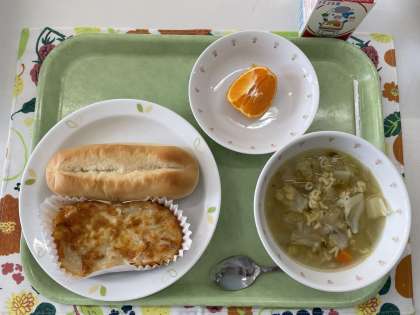 献立 ソフトフランス シェパーズパイ ABCスープ はやか 牛乳