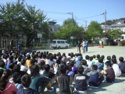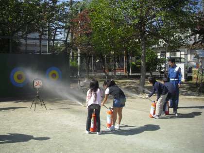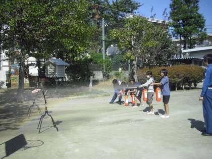10月4日(火)の避難訓練は、主事室から出火したという想定で行いました。避難終了後、北沢消防署の方から消火器の使い方を教えていただきました。(写真左)その後、6年生は全員で実際に消火器を使った放水訓練を行いました。(写真中・右)