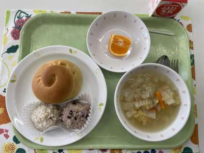献立 明日葉パン チンジュワンズ 白菜のスープ はれひめ 牛乳