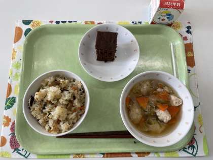 献立 明日葉ご飯 めだいのつみれ汁 浮島(ココア) 牛乳