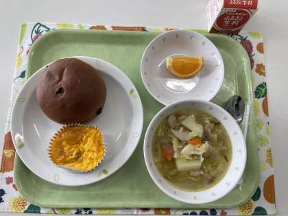 献立 チョコチップパン ミートオムレツ ポトフ いよかん 牛乳