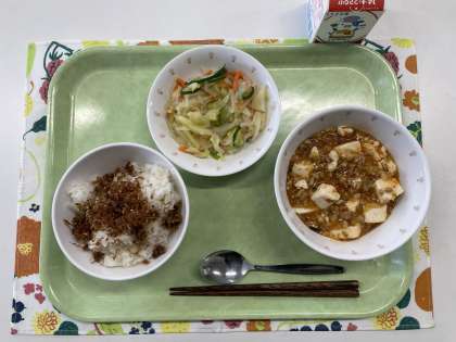 献立 ごはん ふりかけ シーホー豆腐 春雨サラダ 牛乳