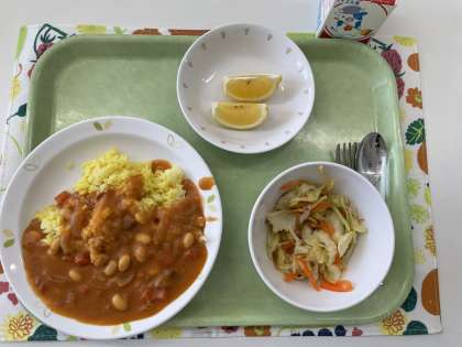 献立 ガーリックライス ポークビーンズ じゃが芋のハニーサラダ はるか 牛乳