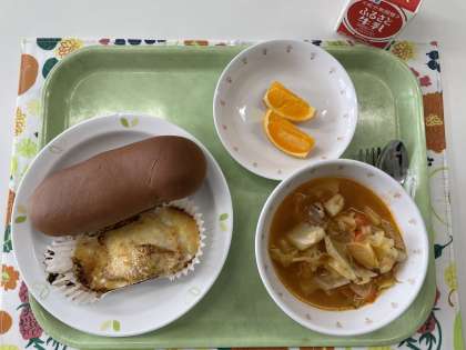 献立 ココアパン 鶏のパン粉焼き 野菜とトマトスープ 清見オレンジ 牛乳