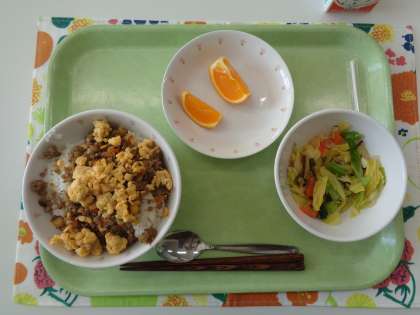 献立 大豆のそぼろご飯  塩昆布のサラダ オレンジ