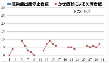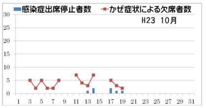 また、『かぜで欠席しているんだけど、なかなか熱が下がらないな(高い熱が3日以上続いてるな)』といった場合は、かぜだと思わず再度医療機関を受診されることをお勧めいたします。               平成23年10月19日