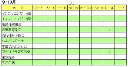 10月の感染症は、今のところマイコプラズマ肺炎1名、溶連菌感染症2名です。