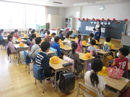 4月7日、入学した1年生の小学校生活がスタートしました。朝の会では担任の先生の話をよく聞いて活動していました。