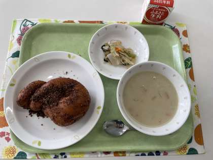 献立 ココア揚げパン じゃが芋のポタージュ こんにゃくサラダ 牛乳