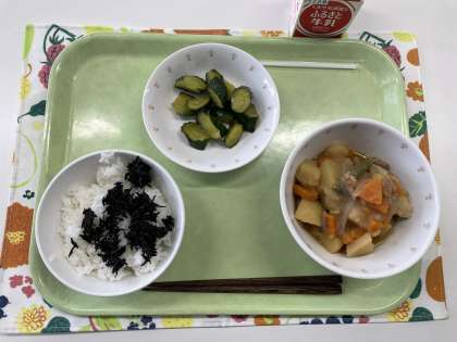 献立 ごはん ひじきふりかけ 肉じゃが きゅうりの南蛮漬け 牛乳