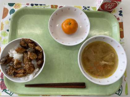 献立 しいらの揚げ煮丼 めった汁 冷凍みかん 牛乳