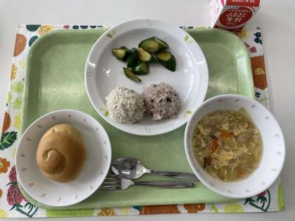 献立 あしたばパン チンジュワンズ ピリ辛きゅうり たまごスープ 牛乳
