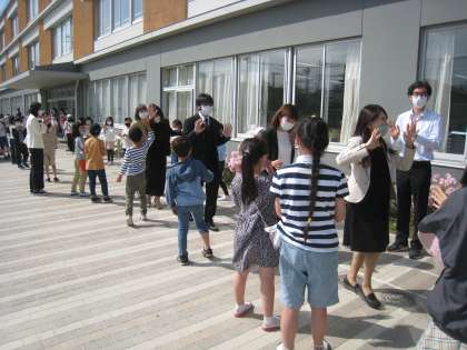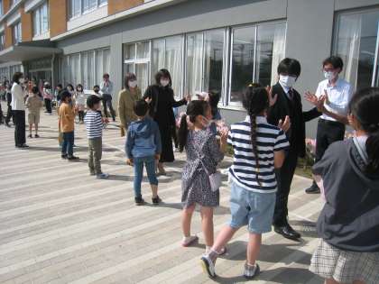離任式後は子どもたちによる最後の見送りです。本当にお世話になりました。