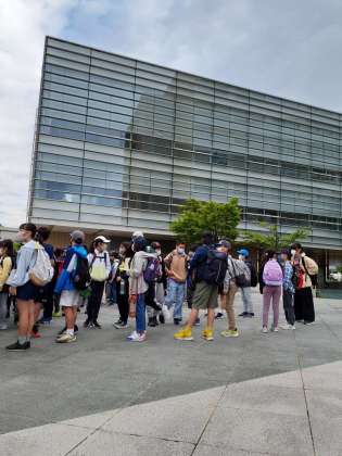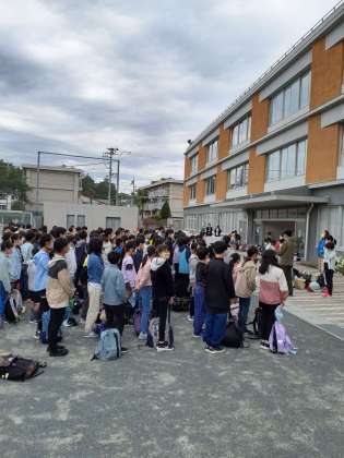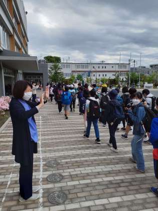 雨も上がり、5、6年生の遠足に出発します。バスを待っています。みんなのめあては、みんなで協力し、人のことを考えて行動するです。