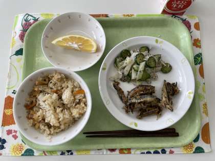 献立 こぎつねご飯 きびなごのごま揚げ 野菜のゆかりかけ ジューシーフルーツ 牛乳