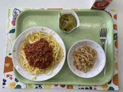 献立 スパゲティミートソース もやしサラダ 抹茶蒸しパン 牛乳