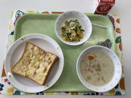 献立 ツナポテトースト さつまいものシチュー コーンサラダ 牛乳