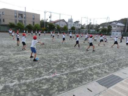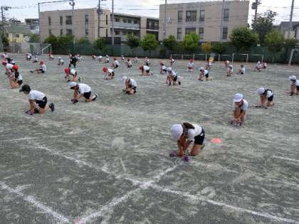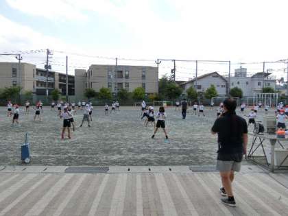 午後は、4年生の練習からスタートしました。鳴子の音と子どもたちの動きがシンクロしてとてもきれいです。一人一人の動きに加え、集団でそろえたり、隊形を移動したり、全体で表現をします。高学年の仲間入りをした4年生らしい動きを見ることができました。
