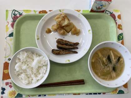 献立 ごはん 小いわしの唐揚げ じゃが芋の甘辛煮 みそ汁 牛乳