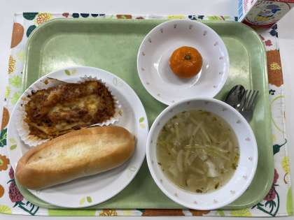 献立 ソフトフランス ミートマカロニグラタン 千切り野菜のスープ 冷凍みかん 牛乳