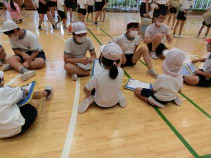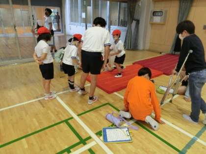 本日は、少し、涼しく感じる中で、体力テストに取り組んでいます。1年生と6年生がペアになって計測し、記録していきます。6年生が1年生に上手に教えてあげたり、記録を共に喜び合う姿が素敵です。順番を待っているときも、6年生が上手に話し相手になってくれています。