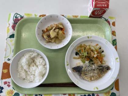 献立 ごはん 鯵のパン粉焼き 寒天サラダ そぼろ煮 牛乳