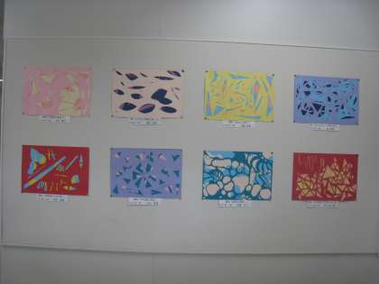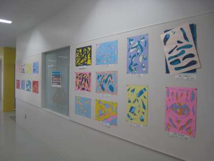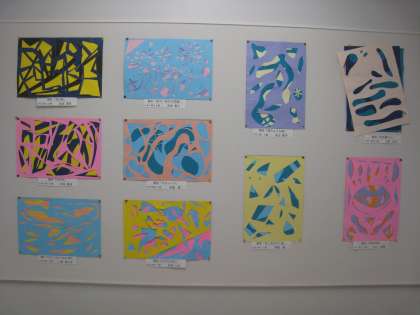 5年生の作品を図工室前の壁面に展示しました。題材名は「カット、ペタっと、すてきな形」、子どもたちが3枚の色画用紙を選び、自由に切った形や色を組み合わせながら画面構成しました。偶然できた形を組み合わせることでイメージを広げ、色彩感覚を養うことがねらいです。