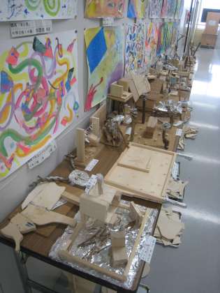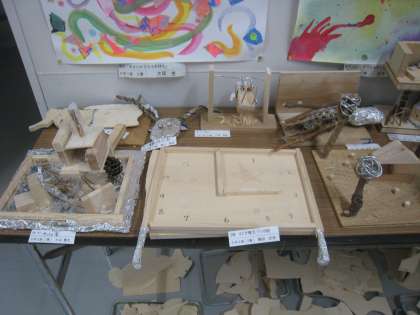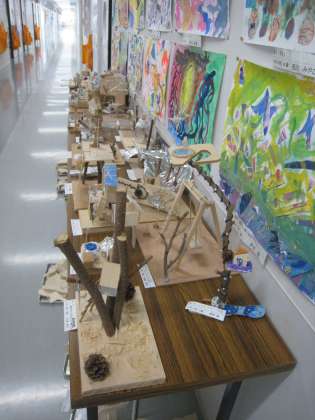図工室前の廊下に6年生の作品を展示しました。題材名は「木と金属でチャレンジ」、子どもたちは、必要な素材を選んで木材と金属の組み合わせ方を工夫しながら制作しました。自分のイメージを表すために、様々な接着方法を考えて独創的な作品に仕上がっています。