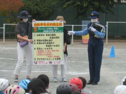 6月23日、3年生対象の自転車安全教室を行いました。北沢警察交通安全課の職員の方をゲストティーチャーにお招きし、交通安全指導ボランティアの方や3年生保護者の皆様にお手伝いいただきました。子どもたちは自転車安全利用五則を教えていただき、正しい自転車走行を習いました。