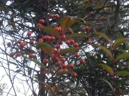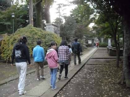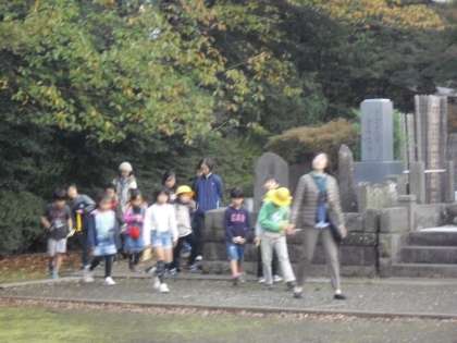 11月15日(火)の午後3時50分から今年度3回目の夕方探鳥会を行いました。1、2年生を中心に20数名の児童と2名の保護者の方も参加しました。正門を出て、緑道近くの住宅街を歩いて豪徳寺にむかいながら、インストラクターの方に鳥が好んで食べる木の実をいくつか教えていただきました。空き地の中に実をたくさんつけたアケビのつるが巻きついた木もありました。